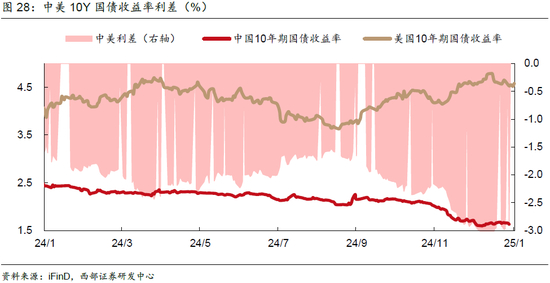 中美10Y国债利差走阔。1月,中美10Y国债收益率倒挂月均值为301bp,较24年12月均值走阔约42bp。
