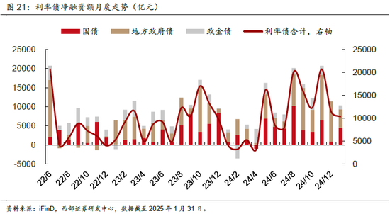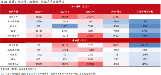 3、25年1月利率债净融资小幅回落。国债发行规模环比上升。地方债发行规模环比下降、同比上升。存单净融资额大幅下降,月度发行利率小幅下行。