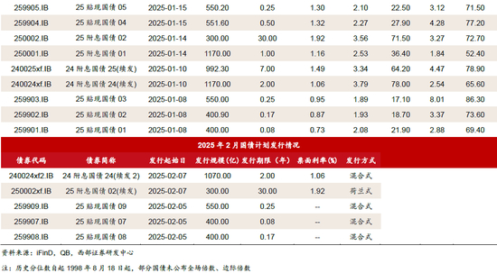 2025年1月国债发行规模环比上升。2025年1月1日-1月31日共发行国债13只,合计发行规模10185亿元,较2024年12月增加3425亿元,其中发行期限1年及以内的占比为41%。截至2025年2月3日的iFinD数据,2025年2月计划发行国债2720亿元。