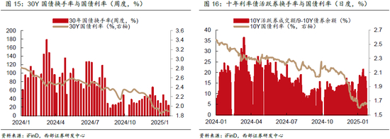 春节前一周(25年1月20日~1月24日当周)长债超长债换手率下降、银行间杠杆率低位运行、隐含税率小幅走阔,但交易所杠杆率继续上行;全样本基金久期基本持平。其中,30Y国债换手率降至24%;10Y利率债活跃券换手率周均值下降至13%;银行间杠杆率持平于106.8%、交易所杠杆率上升至125.4%;基金久期中位数持平于2.74年、分歧度有所上升,其中利率债基金久期小幅下行至3.35年;春节前10年国开债隐含税率小幅走阔。