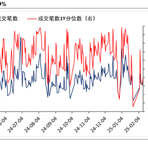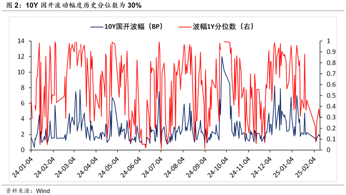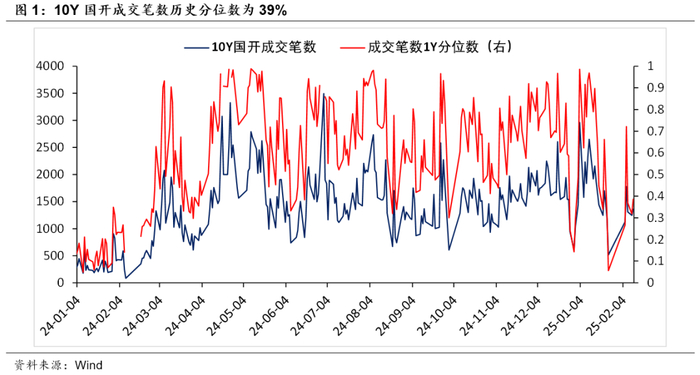 一月中旬以来,利率下行速度趋缓,债市呈现横盘震荡格局。对当前行情进行统计量化,以活跃品种10Y国开为例,其日内波幅过去一年历史分位数为30%、成交笔数分位数为39%、波动率分位数为51%,综合衡量的整体波动水平分位数为40%,处于去年下半年以来低位。