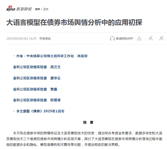 债券市场受宏观经济、货币政策等多重因素影响,普通投资者往往难辨趋势。新浪财经汇聚顶尖金融机构分析师、经济学家,以通俗语言拆解专业内容。例如,近期央行降准对利率债的影响、城投债风险预警等热点话题,都能在这里找到清晰的投资逻辑。跟随市场热点,近期DEEPSEEK、人工智能等关键词大热,新浪财经APP也第一时间转载发布了“大语言模型在债券市场舆情分析中的应用初探”等文章。