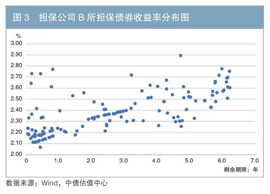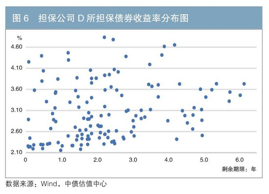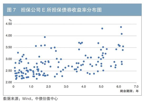 担保人资信等级以其发行的可续债估值水平5为标准,结合各股东支持能力、公司资产规模、盈利能力等财务数据,基本可将7家担保公司信用资质由高至低排序为信用增进A、担保公司A、担保公司B、担保公司C、信用增进B、担保公司D、担保公司E。图1至图7估值收益率散点图分布显示,信用资质越高的担保人,担保债券向其靠拢程度越高,反之则越分散,信用溢价水平也越高。