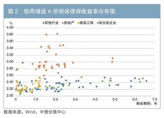 在大部分担保债券向担保人信用资质水平靠拢的同时,少数债券估值明显高于均值。进一步分析发现,这主要受发行人所在行业影响,且发行人负面舆情也会对定价造成显著影响。选取7家担保公司当中所担保债券发行人行业分散度较高的信用增进A作为分析对象。2024年6月末,信用增进A在保债券120只,其中房地产管理和开发行业36只,占比30%;建筑与工程行业38只,占比31.67%;综合类行业25只,占比20.83%;其他行业21只,占比17.50%。图2散点图显示,房地产开发企业担保债券估值水平显著高于其他行业,且其余行业的债券估值收益呈紧密靠拢状态。此外,房地产开发企业的债券收益率离散程度也较高,主要受发行人信用资质影响。
