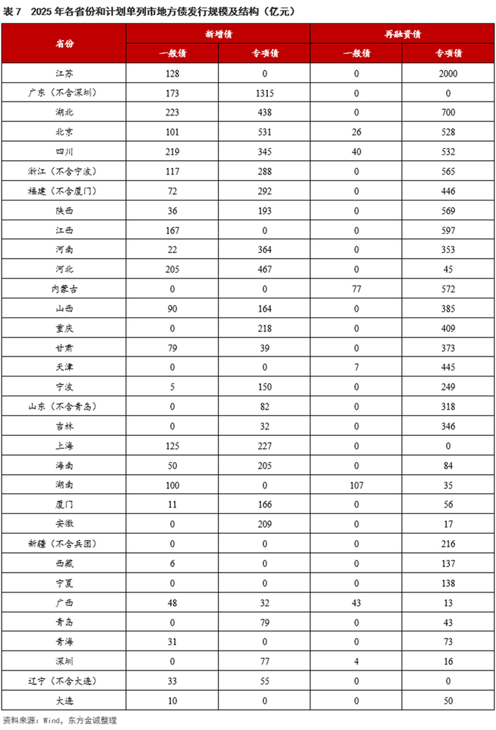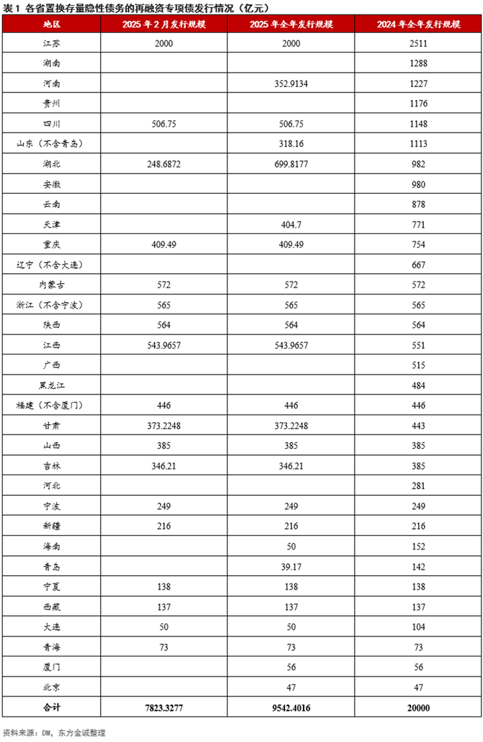 2月,共有18个省份和计划单列市发行用于置换存量隐性债务的再融资专项债,合计发行规模约7823亿元,占当月地方债发行总额的59.9%。1-2月累计,共有25个省市发行9542亿元置换隐债再融资专项债,其中,内蒙古、浙江、陕西等12地2025年度置换额度或已用完。