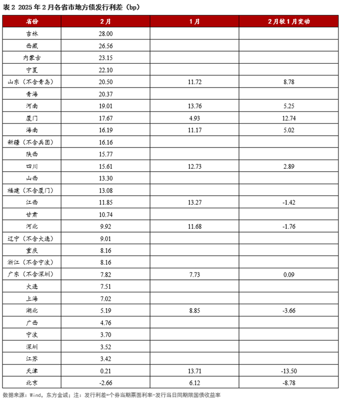 从发行利率看,2月地方债各期限发行利率多数上行,加权平均发行利率回升至1.93%,但上行幅度不及同期限国债,各期限发行利差多数被动收窄;吉林和西藏地方债发行利差水平相对较高。