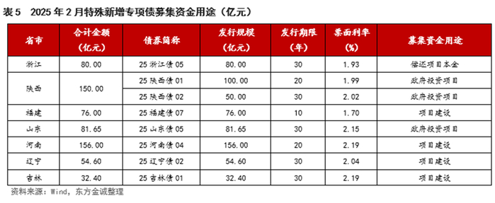 2月,共有7个省市发行特殊新增专项债(未披露“一案两书”),合计规模630.65亿元,其中河南和陕西发行规模超过100亿元。整体来看,当月特殊新增专项债发行期限以30年期为主,金额加权平均发行期限为23.53年,比其他新增专项债长6.16年;募集资金用途包括政府投资项目(231.65亿元)、项目建设(319亿元)和偿还项目本金(80亿元)。