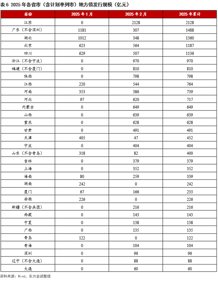 2月共有30个省市(含计划单列市)发行地方债,其中,江苏、浙江、福建发行规模位列前三。1-2月累计,江苏、广东、湖北地方债发行量居前。