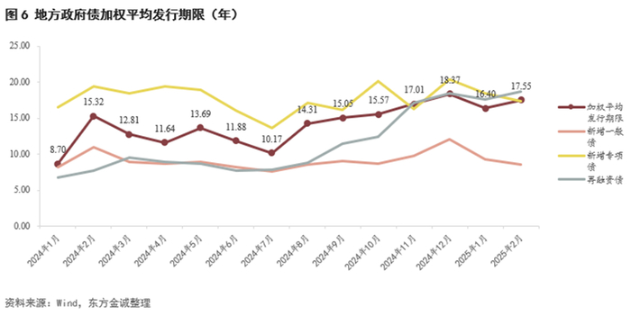 从发行期限看,2月地方政府债加权平均发行期限为17.55年,较上月拉长1.15年,主因当月大规模发行的用于置换存量隐性债务的再融资债发行期限较长。具体来看,2月新增一般债、新增专项债加权平均发行期限环比分别缩短0.66年和1.07年至8.62年和17.37年;再融资债加权平均发行期限环比拉长1.19年至18.77年。