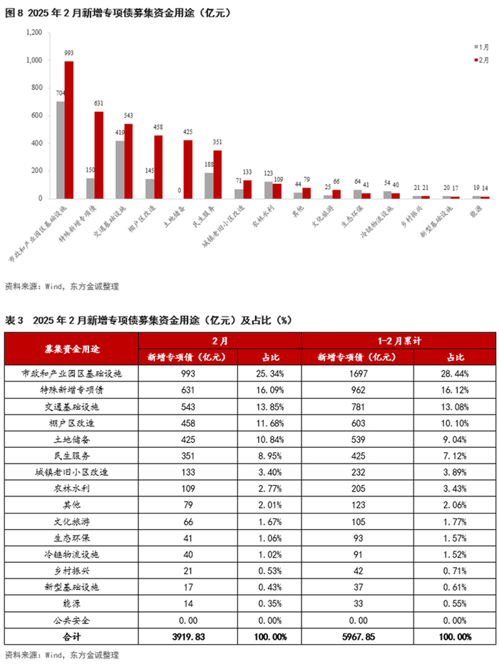 从新增专项债募集资金用途来看,基建领域仍是主要发力点,投向“棚户区改造”和“土地储备”的资金大幅增长。2月投向“市政和产业园区基础设施”、“交通基础设施”和“棚户区改造”三个领域的资金合计占比为50.87%,环比下降1.1个百分点。2月7省市发行8只未披露“一案两书”的特殊新增专项债,占当月新增专项债发行量的16.09%。
