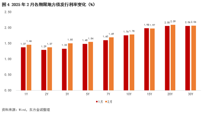2月,地方债加权平均发行利率环比上行5.65bps至1.93%,各期限发行利率整体上行。具体看,2月1年期、2年期、3年期、5年期、7年期、10年期、20年期和30年期地方债发行利率环比分别上行8.52 bps、8.00bps、17.22bps、5.81bps、8.74bps、1.88bps、3.82bps和0.80bps;15年期地方债发行利率环比下行1.23bps。