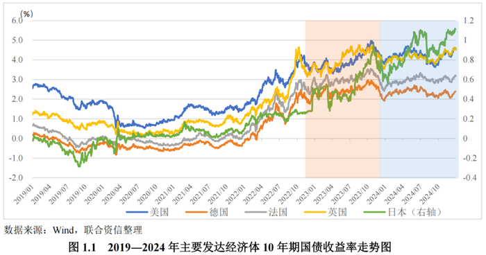 2023年,为抑制通胀上涨,全球主要经济体央行保持紧缩性货币政策。在此背景下,美国、德国、法国、英国的10年期国债收益率均整体呈震荡上行走势,且波动幅度较上年显著增大。2024年,随着通胀水平回落至目标区间,全球多国央行开启政策转向提振经济。美联储、欧洲央行和英国央行均进入降息周期,日本央行则持续推进货币政策正常化。本年度金融风险和经济下行压力增大成为影响国债收益率走势的重要因素,各国国债收益率呈现波动型走势。