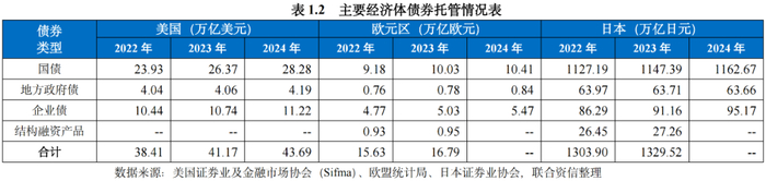 2023年至2024年全球国债收益率整体呈震荡上行走势。2023年,美国和日本主要债券品种发行量较上年小幅下降,欧盟主要债券品种发行量小幅增长;2024年,各国发行总量整体有所增长。截至2024年末,全球主要经济体托管规模均有所增长。
