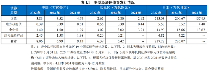 美国方面,2023年,受政府持续缩减发债规模和债务融资成本上涨的影响,美国主要债券品种发行量延续下降走势,发行总量为6.99万亿美元,较上年下降13.34%。其中,国债发行量为3.52万亿美元,同比下降8.07%,仍是年度发行规模最大的主要债券品种;地方政府债、企业债1和结构融资产品发行量分别为0.39万亿、1.50万亿和1.59万亿美元,其中企业债发行规模小幅上涨,地方政府债和结构融资产品延续下降走势,结构融资产品降幅超过35%,是降幅最大的债券品种。2024年,美联储开启降息周期,美国主要债券品种发行量显著增长,发行总量为9.13万亿美元,较上年上涨30.70%,其中国债、地方政府债、企业债和结构融资产品发行规模分别为4.67万亿、0.51万亿、1.97万亿和1.98万亿美元,较上年分别上涨32.78%、33.16%、30.87%和25.32%。