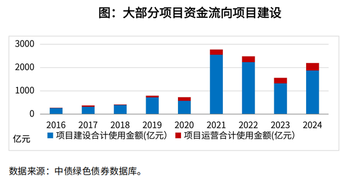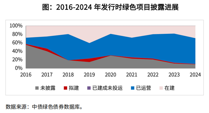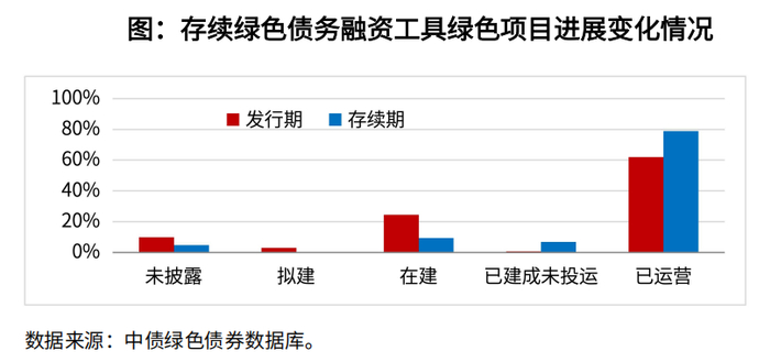 募集资金实际用途上,85%项目资金用于支持项目建设。基于2024年穿透后资金分配数据, 85%用于项目建设阶段的资金使用(含偿还建设贷款),15%用于项目运营。项目进展方面,绝大多数拟建在建项目都取得了推进。基于绿色债务融资工具开展存续期信息披露2的2,000个绿色项目数据来看,存续期95%的绿色项目在2024年披露了项目进展状态,其中85%的项目处于运营阶段,10%的项目处于拟建和在建状态,5%的项目未披露进展。与发行阶段相比,前述项目中34%状态出现变化,其中在建占比由25%下降到9%,拟建由3%下降到0.3%,绝大多数拟在建绿色项目在存续期都取得了一定进展。