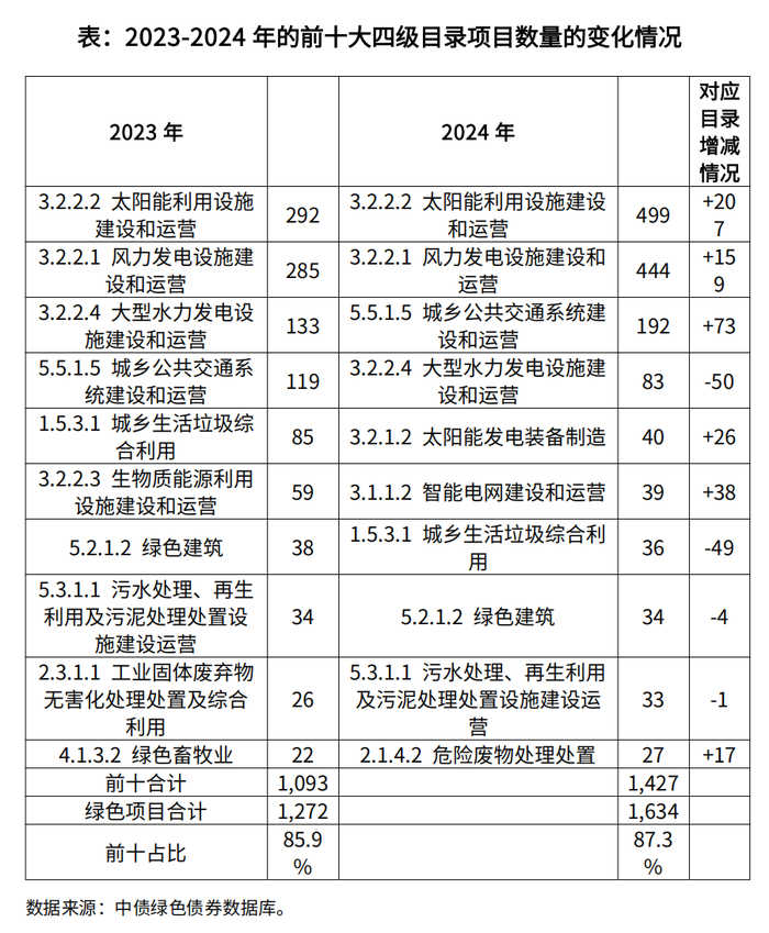 绿色债券市场亦大力支持了代表国家新质生产力发展的“新三样”产品生产。对应“新三样”的“1.6.1.1 新能源汽车关键零部件制造和产业化”(新能源汽车、动力电池)和“3.2.1.2 太阳能发电装备制造”(光伏电池)两个目录所支持的绿色项目数量2024年同比大幅增长了120%,绿色债券市场与国家整体绿色产业发展高度呼应。