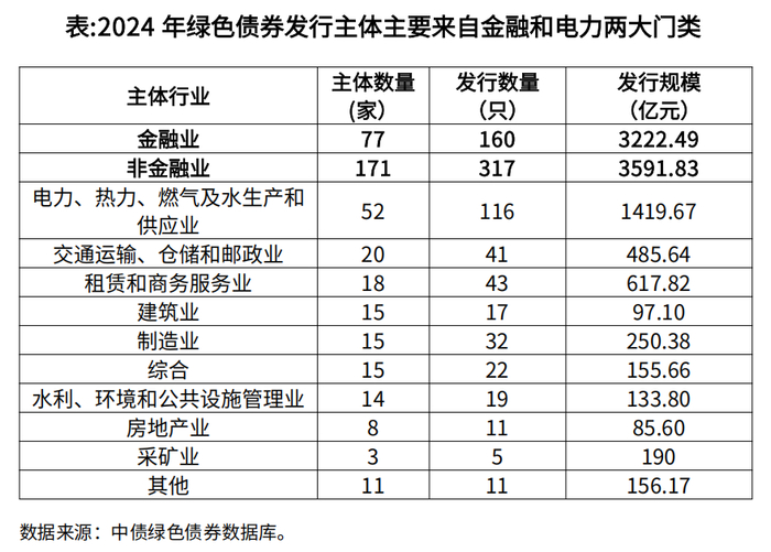 从主体行业分布来看,金融业3主体数量保持领先,2024年,77个金融行业主体累计发行160只,共计3222.5亿元绿色债券,发行规模同比回落37.9%。相比之下,303个非金融行业主体累计发行317只绿色债券,计3591.8亿元,实现12.6%的增长,绿色资金直接支持实体经济低碳发展的力度进一步加大。在非金融行业主体中,电力、热力、燃气及水生产和供应业主体表现最为突出,共发行116只绿色债券,计1419.67亿元,同比增长16.6%。交通运输、仓储和邮政业主体数量2024年超越租赁和商务服务业,位居非金融行业第二,发行规模也实现了39.2%的增长,这与绿色交通领域的持续投资、交运行业发行人发行活跃的关联较大。此外,租赁和商务服务业,以及制造业主体的发行规模分别实现了25.2%和58.3%的大幅增长,双双成为绿色债券市场增长的行业新引擎。