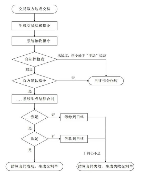 在结算日系统运行时间内,因指定券种数额暂时不足,或款项暂时未足额到账而未能成功办理结算的结算合同,系统将其放入等待队列,在结算日日终前若相关条件具备后,系统将再次启动该笔结算的处理流程。在结算日日终券或款项仍不足的结算合同,系统通知相关结算成员结算失败,生成失败交割单。