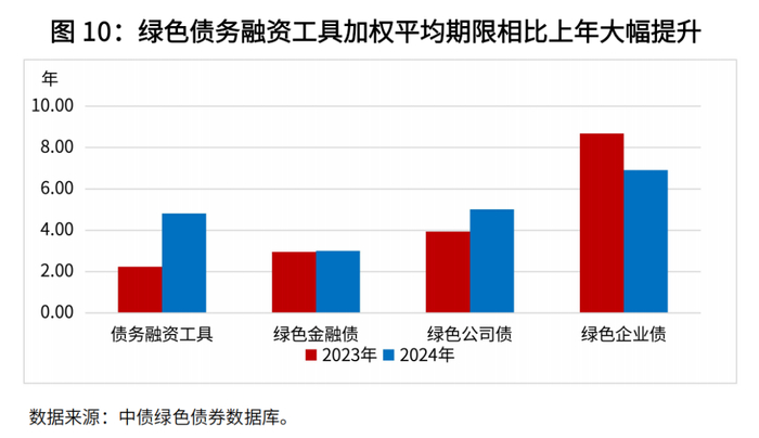 2024年绿色债券市场期限结构4进一步优化。2024年境内市场普通绿色债券加权平均期限为4.0年,相比2023年拉长1.0年。从绿色债券子品种来考察,绿色债务融资工具发行期限达到4.8年,相比2023年拉长2.6年,在各品种中增幅最为明显;绿色公司债、绿色金融债加权平均期限分别为5.0年和3.0年,相比上年也有小幅拉长;绿色企业债虽然平均期限达到6.9年,但相比2023年缩短1.8年。