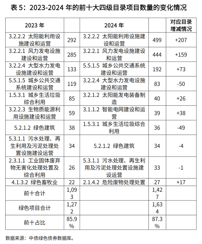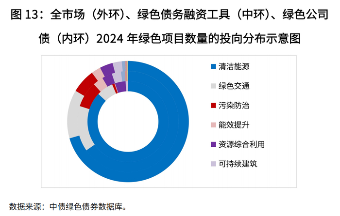 绿色债券市场亦大力支持了代表国家新质生产力发展的“新三样”产品生产。对应“新三样”的“1.6.1.1 新能源汽车关键零部件制造和产业化”(新能源汽车、动力电池)和“3.2.1.2 太阳能发电装备制造”(光伏电池)两个目录所支持的绿色项目数量2024年同比大幅增长了120%,绿色债券市场与国家整体绿色产业发展高度呼应。