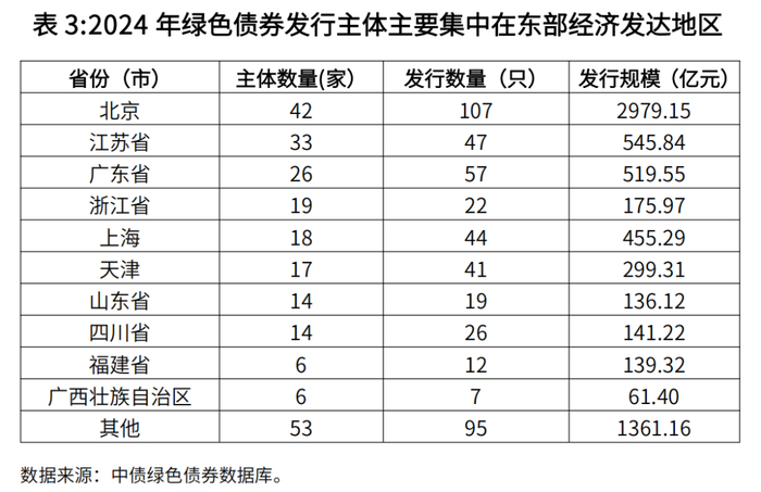 发行主体区域分布集中度偏高,2024年绿色债券发行人遍布于24个省级行政区,发行规模前5名的地区均为东部发达地区,主体数量占全国的55.6%,发行数量与规模的占比更是分别达到了58.1%和68.2%,区域集中度较高。从债务融资工具发行主体地域分布来看,西部地区民营企业或成为新的增长点。2016年至2020年,绿色债务融资工具民营主体单一集中在北京、广东,以及江苏等东部地区。2021年起,民企地域覆盖度明显加大,将安徽、河南等中部省份纳入版图。2022年,四川等西部地区民营主体开始参与银行间绿色债券发行。2024年,四川省辖内的民营主体共发行9只绿色债务融资工具,超过传统强省广东位居第一,同时也创下了历年单一地区民营企业绿色债务融资工具发行数量纪录。西部地区水、风、光等清洁能源资源丰富,大量民营企业存在绿色债券市场融资需求。