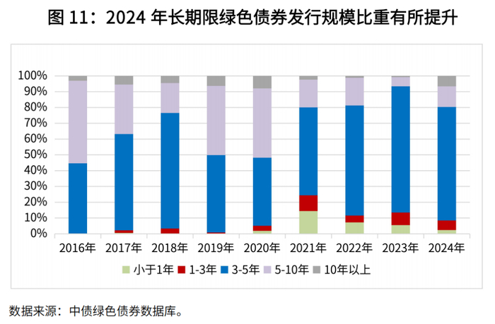 与普通绿色项目相比,清洁能源、绿色交通类项目绿色效益更为显著,投资回收期也普遍偏长,更倾向于发行长期限债券,有利于绿色债券拉长久期。2024年长期限绿色债券比重的提升顺应了这一趋势和有利条件,一方面能够更好满足该类项目的建设与运营需求,为国民经济的低碳转型做出长期稳定贡献,另一方面可以帮助绿色项目在债券收益率历史低位锁定长期低成本资金。
