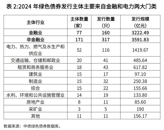从主体行业分布来看,金融业5主体数量保持领先,2024年,77个金融行业主体累计发行160只,共计3222.5亿元绿色债券,发行规模同比回落37.9%。相比之下,303个非金融行业主体累计发行317只绿色债券,计3591.8亿元,实现12.6%的增长,绿色资金直接支持实体经济低碳发展的力度进一步加大。在非金融行业主体中,电力、热力、燃气及水生产和供应业主体表现最为突出,共发行116只绿色债券,计1419.67亿元,同比增长16.6%。交通运输、仓储和邮政业主体数量2024年超越租赁和商务服务业,位居非金融行业第二,发行规模也实现了39.2%的增长,这与绿色交通领域的持续投资、交运行业发行人发行活跃的关联较大。此外,租赁和商务服务业,以及制造业主体的发行规模分别实现了25.2%和58.3%的大幅增长,双双成为绿色债券市场增长的行业新引擎。