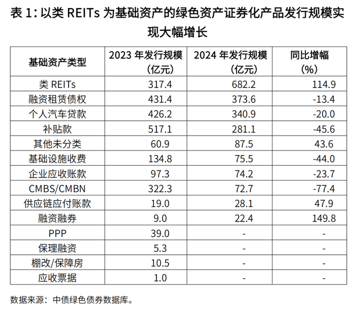 结构化产品份额逐年提升,类REITs产品成为主要驱动力量。2024年,绿色结构化产品累计发行2038.1亿元,同比回落14.8%。虽然绝对规模出现下滑,但结构化产品规模占比达到29.9%,相较2023年提升1.4个百分点,市场份额连续七年攀升。根据结构化产品上市地点不同,将绿色资产支持证券分为银行间ABN、交易所ABS,以及金融ABS。交易所ABS和金融ABS发行规模占比有所下降,银行间ABN共发行719.7亿元,份额从上年的30.9%提高至35.3%。从结构化产品基础资产类型划分3来看,2024年以类REITs作为基础资产的绿色资产证券化产品发行规模最大,共计682.2亿元,比重达33.5%,规模相较上年增长1.1倍,成为第一大基础资产类型,带动绿色结构化产品市场份额提升。