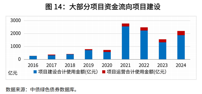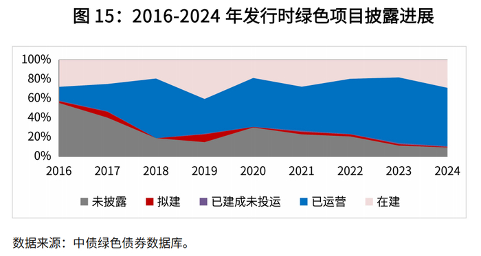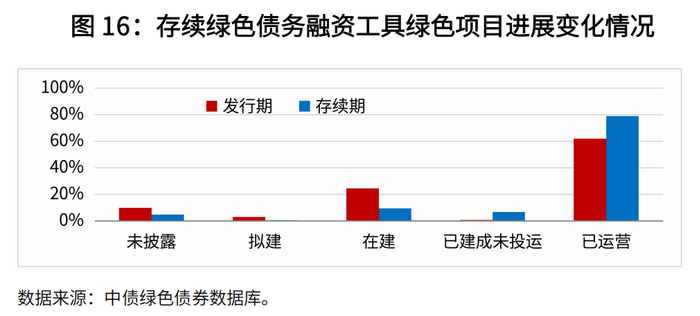 募集资金实际用途上,85%项目资金用于支持项目建设。基于2024年穿透后资金分配数据, 85%用于项目建设阶段的资金使用(含偿还建设贷款),15%用于项目运营。项目进展方面,绝大多数拟建在建项目都取得了推进。基于绿色债务融资工具开展存续期信息披露7的2,000个绿色项目数据来看,存续期95%的绿色项目在2024年披露了项目进展状态,其中85%的项目处于运营阶段,10%的项目处于拟建和在建状态,5%的项目未披露进展。与发行阶段相比,前述项目中34%状态出现变化,其中在建占比由25%下降到9%,拟建由3%下降到0.3%,绝大多数拟在建绿色项目在存续期都取得了一定进展。