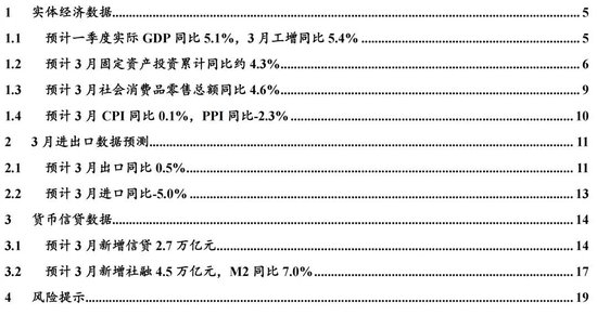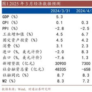 我们预计一季度实际GDP同比5.1%,3月工业增加值同比5.4%,固定资产投资累计同比4.3%,社零同比4.6%,CPI同比0.1%,PPI同比-2.3%。