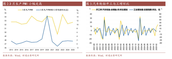 从历史来看,3月工增非季调环比与生产PMI的相关性较高,从2023年开始,年初工增冲量现象相对明显,我们判断2025年3月工增非季调环比继续维持高位、但略弱于去年,同比约5.4%。