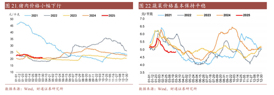 蔬菜方面,冬季未出现极端天气,且整体气温适宜,果蔬供应充足,价格上行动能较弱。