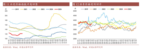 3月建筑业PMI较1-2月均值回升2.4个百分点至53.4%,回升幅度低于季节性,绝对水平为近10年中最低点。从高频数据来看,水泥价格低位回升后小幅回落,沥青价格有所回升,基本符合季节性。根据百年建筑调研显示,2025年春节后工地开工复工节奏整体偏慢,但是进入3月中下旬,各地重点项目集中开工,尤其是华东、华南地区受天气好转影响,施工进度加速。综合来看,3月基建增速可能不低。