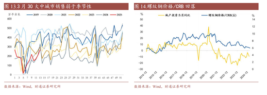 3月地产销售整体偏弱,新开工和施工或仍维持弱势。3月以来一线城市新房表现依旧较好,二手房持续强于季节性,但二三线城市明显偏弱;土地成交量略低于季节性,土地成交溢价率基本符合季节性,但较近三年同期显著改善,新开工有望弱修复;螺纹钢/CRB表现偏弱,施工强度不高,施工增速难有大幅回升。