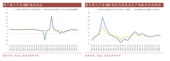 对于GDP,我们使用生产法进行测算。由于第一产业GDP占比低、波动小,因此基于季节性进行粗略估算;第二产业基于工增和建筑业进行拟合;第三产业基于服务业生产指数进行拟合。分别拟合过后进行加总,并计算同比。