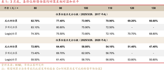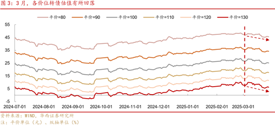 转债估值层面,各价位转债估值有所回落。3月初,转债仍然处于“越买越贵,越贵越买”的状态,但估值已来到高位,继续向上非常依赖正股强支撑。随着正股科技行情回落,转债估值高位平衡的状态随之松动。截至3月28日,80元平价对应的估值中枢为45.58%,相较2月28日环比下降2.05个百分点;100元平价对应的估值中枢为25.11%,环比回落2.00个百分点;130元平价对应的估值中枢环比压缩1.95个百分点至6.21%。