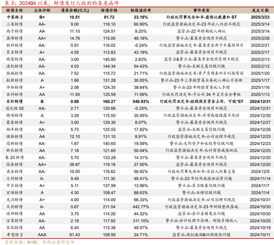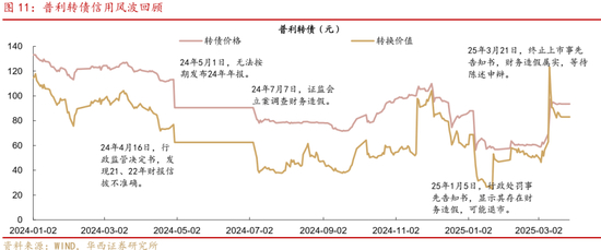 另一方面是,连续两年发生的转债信用冲击难免引发季节性忧虑。原因也很明确:2023、2024业绩期之后正股行情表现较差,而转债发行人的弱资质特征会在此期间得以暴露,如ST风险、年报问询函、各类处罚以及评级下调压力等。进而转债投资者会将此类事件与行情联系在一起,引发砍仓式出库回调。从目前情形来看,实质性信用压力主要还是集中在已经风险暴露的中装转2、东时转债及普利转债等,暂未出现超预期事件。