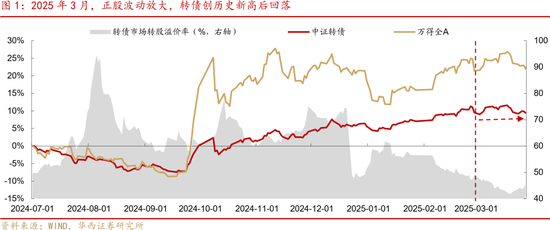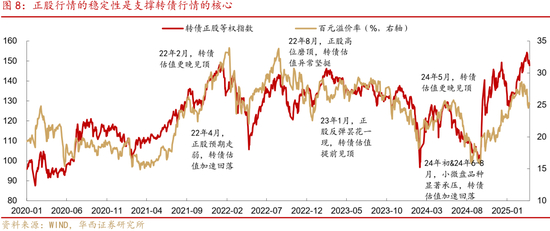 事实上,历史上多轮大行情都是在估值高位平衡下继续演化的,只是溢价水平越高,后续行情稳定性就越需要正股的支撑。如2022年1月中旬,正股历史级别行情推动下,转债估值刷新2017年扩容以来高点,随后正股快速回调,但转债估值却继续拉伸,直至2月中旬才见顶回落。无独有偶,同年8月,正股同样迎来连续数月的单边行情,即使略弱于上一轮,但转债估值依然再度触及历史高点。24年2-5月,在正股“重建”式上涨之下,转债估值也更晚见顶。这意味着,只要正股行情维持强势,转债估值就不会成为负担,反而会更加坚挺。反之亦然,正股行情持续走弱时,转债可能面临正股&估值双杀的困境。