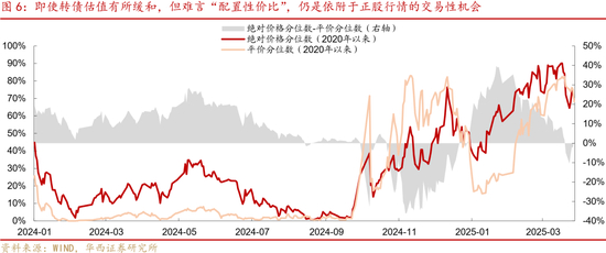 不过,即使资金进行了兑现降波操作,转债估值依然处于较高位均衡状态。去年四季度以来,转债经历了一轮完整的滞涨-补涨-均衡的行情演化过程。我们统计了2020年以来全市场转债价格及平价中位数的历史分位数,从2024年初至今的结果来看,转债24H1在增量资金驱动下保持着较强表现,但在信用风波泥沙俱下的环境下,转债价格和平价均来到历史低位。9月24日一揽子政策之后,转债滞涨特征明显,转债价格历史分位数明显低于平价。进入2025年,收益荒逻辑推动转债迎来补涨,转债价格历史分位数迎来显著反超。近期在正股波动放大以及转债兑现情绪加重的影响下,转债价格和平价高位回落后仍处于相对高位。与此同时,二者历史分位数水平几乎持平,转债价格并未显示出24Q4相比正股明显低估的状态。这意味着,即使转债估值有所趋缓,当前水平暂时还难言“配置性价比”,而仍是依附于正股行情的交易性机会。