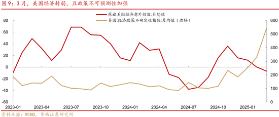 其二,海外尤其是美国的不确定性因素集中来临,关注关税、贸易制裁等可能出现的超预期变化。首先,美国经济本身出现明显放缓迹象,影响全球需求。3月花旗美国经济意外指数转负,以及美联储3月会议FOMC也强调了经济前景的不确定性加重。其次,美国关税政策反复,存在显著加码倾向。即使4月2日对等关税落地,依然存在后续渐进加征及非关税贸易壁垒的压力。最后,特朗普上任百日将至,政策可预测性差,美股估值也受其拖累,影响全球风险偏好。