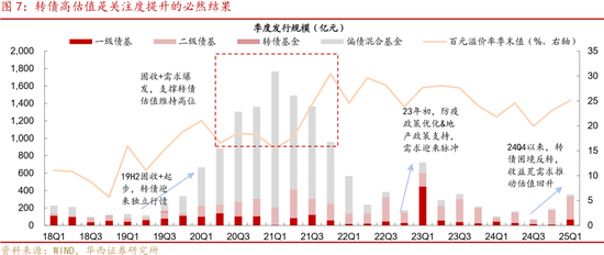 当然,转债的估值高也不是坏事,作为债市中的迷你板块,需求稍有涌入,转债高估值就会成为关注度提升的必然结果。以公募固收+基金发行作为需求的简化表征,2019年下半年,固收+概念逐步深入人心,转债迎来独立行情。2020-2021年的天量固收+基金发行规模,支撑2021-2022近两年的高估值状态。即使是23年初的脉冲行情,同样也吸引了较多固收+需求。24Q4以来,转债困境反转,固收+发行回暖,推动转债估值回升至常态水平。