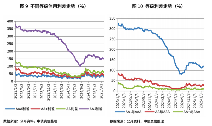 信用利差方面,2025年一季度不同等级信用利差虽呈现波动但均较年初水平小幅压缩,不同等级信用利差表现有所分化。具体而言,截至3月26日,3年期AAA、AA+、AA、AA-信用利差较2024年末分别下调7.73bp、11.32bp、10.52bp和21.6bp。等级利差方面,AA-、AA、AA+与AAA的等级利差相较年初水平压缩13.87bp、2.79bp和3.59bp。分行业看,房地产、国防军工、公用事业、非银金融等行业信用利差相较年初明显下行,而城投、钢铁、计算机等行业信用利差相较年初小幅增加,行业之间信用利差走势呈现分化。
