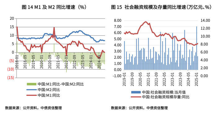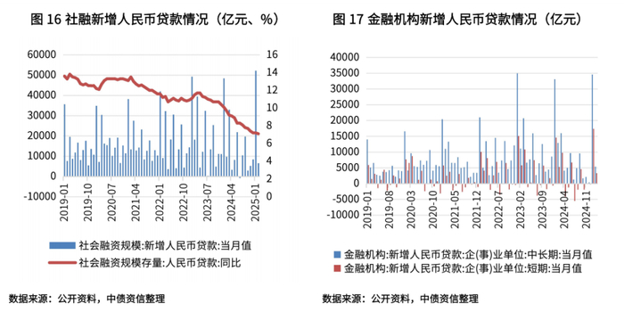 银行信贷方面,2025年1~2月金融机构新增人民币贷款6.14万亿元,整体规模相较去年同期下降约0.23万亿元,新增贷款主要来自企业部门。具体而言,1-2月企(事)业单位新增贷款5.82万亿元,主要是经济复苏预期和基础设施建设推动的中长期贷款增长;同期居民新增人民币贷款547亿元,主要为春节假期效应导致下短期贷款大幅减少所致,中长期贷款表现虽有所回升但整体仍处于较低水平,居民收入预期及消费意愿仍不足。从信贷成本来看,2025年金融机构一般贷款加权平均利率继续下行,利率处于历史低位水平(截至2024年12月末利率3.82%,相较去年同期下降53bp),融资成本进一步降低。
