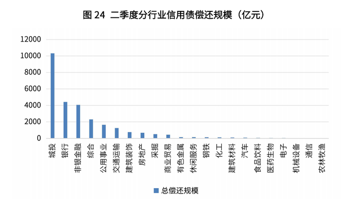 从分行业来看,分行业债券偿还规模依然以城投、非银金融、银行、综合等行业居首,交运、公用事业等行业排名也较靠前。其中,城投债二季度债券总偿还规模达1.03万亿元。随着一揽子化债政策、债务置换政策等持续推进,城投行业短期偿债压力得以明显缓解,融资成本和债务期限结构均改善,短期内城投行业公募债券市场违约的可能性很低。两会对化债工作的部署延续了去年11月“化债新政”提出的“在发展中化债、在化债中发展”政策取向,城投平台产业化转型及退平台改革加速推进,在此过程中一是需要关注平台市场化转型效果,平台转型对区域资源禀赋和优质产业依赖较大,区域资源禀赋差的企业经营性转型压力较大,需要警惕城投盲目转型可能导致的资金回收风险;二是退平台过程中需要警惕部分城投平台换马甲、资产空心化等现象;三是虽然在国家化债政策支持下城投债券风险得以缓释,但非标置换进度较慢,部分区域城投企业对非标依赖度仍较高,需要关注非标债务偿还风险;银行二季度总偿还规模4418亿元。近年来受实体经济压力传导、银行净息差持续下行、金融化债等因素影响,银行盈利能力持续下降,资本补充压力加大,随着特别国债注资政策的逐渐推进,预计国有大行资本压力将得以缓解,但中小银行资本补充压力仍较大,需要关注资产质量弱化明显、业务发展激进、公司治理存在瑕疵等中小银行的流动性压力及资本补充压力,以及在资本补充压力下次级、永续等债券不赎回所引发的市场波动风险;非银金融二季度到期及行权总规模为4064亿元,资产质量下行压力相较银行更为突出,需重点关注资产质量弱化明显、资本补充压力或再融资压力较大的机构相关风险;房地产行业二季度到期及行权债券规模共计684亿元,规模同比下降较明显,其中民营企业到期及行权规模为296亿元,已发生债券违约或展期的民营企业剩余债券约237亿元,随着风险的持续出清,房地产后续新增风险的空间已较为有限。展望后续,政府工作报告定调房地产行业“止跌回暖”,行业降幅继续收窄,随着政策效果进一步显现,预计行业信用风险逐渐趋稳,但房地产企业资金沉淀规模较大,企业面临融资环境仍将分化,弱资质企业流动性压力不减,个别尾部企业风险仍将继续暴露,并且债券展期转实质违约的风险依然较大。