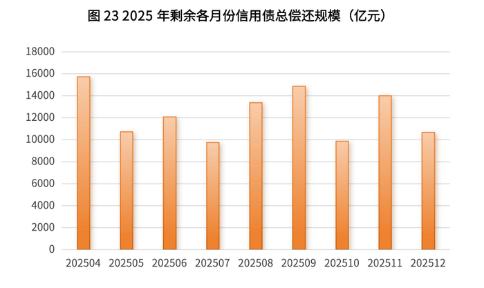 展望二季度,作为“十四五”规划收官之年,2025年政府工作报告中确定本年度国内生产总值增长5%左右的目标,预计二季度各项政策将加快落地,经济基本面继续回升向好。预计更加积极的财政政策仍将靠前发力,央行择机降准降息,社会融资环境仍将保持适度宽松,城投企业债券借新还旧渠道仍畅通,房地产融资协调机制将进一步推进。从债券到期规模来看,2025年二季度信用债(不含短融)总偿还规模3.86万亿元,其中含回售、提前赎回、提前兑付本金等条款的债券规模1.44万亿元,债券市场偿付压力环比抬升。从偿还债券的企业性质分布看,国有企业总偿还规模仍占据绝对主导,二季度共计3.46万亿元,占比约89%,民营企业总偿还规模为3983亿元,同比和环比均有所增加。随着化债政策推进及国家鼓励民营经济、新质生产力融资,政府债券、产业债券供给增量,城投债券供给相对弱,信用债供给结构将优化,发债企业仍以中高信用资质企业为主,预计二季度债券市场新增风险企业的压力不大,但考虑已出险企业债券继续到期,二季度风险债券规模将环比增加。