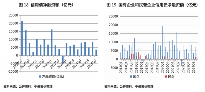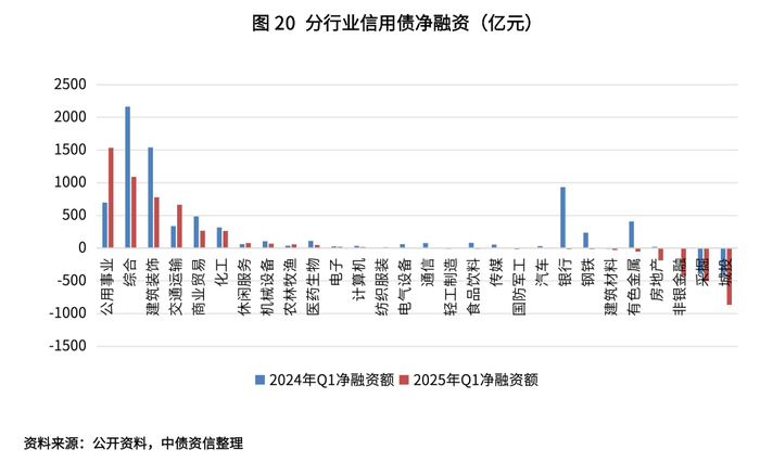 总体来看,2025年一季度货币政策延续宽松基调促进社会融资成本下行,但资金传导的结构性分化依然存在。一是融资渠道方面,政府债券扩容和地方化债置换推动政府类融资同比增多,成为社融增量核心支撑,银行信贷规模受居民端拖累呈现收缩,信用债净融资额同比减少,股票融资维持地位震荡;二是行业层面,房地产行业受销售低迷与债务展期影响,净融资额延续负增长;城投化债政策下融资持续收缩,而基建产业链相关的公用事业、交通运输行业融资有所增长;三是企业性质层面,民营企业在LPR下调带动下融资环境有所改善,但资金仍主要流向头部高等级民企。