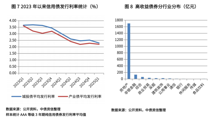 2025年以来,受国内宏观经济弱复苏信号显现、市场资金面持续偏紧、政府债券供给上量导致供需失衡等因素影响,债券市场收益率显著回升,其中短期利率回升更为明显。截至2025年一季度末,国开债1年期、3年期、5年期、10年期和30年期收益率相较年初分别上行41.35bp、32.82bp、24.30bp、8.74bp和11.71bp。分信用等级看,中短期票据收益率同样呈现不同程度上升,其中高等级(AAA)收益率上升幅度相对更大,为25.09bp。高收益债券方面,2025年以来市场发行利率普遍在2%至3%,发行利率超过4%的债券规模占比进一步减少至不足0.5%。截至2025年3月26日,中债估值收益率超过8%的高收益债存量规模仅2090.73亿元,高收益债占信用债存量比例约0.29%,相较去年年末继续下降(2024年末占比为0.55%)。涉及高收益主体共57家,其中城投企业仅剩2家,房地产企业29家,城投高收益债主体数量持续减少。分行业来看,城投高收益债券余额仅约16.48亿元,规模占比不足1%且全部集中于贵州省,高收益债规模大幅压缩(2023年末城投高收益债规模约1,700亿元)。产业债中房地产高收益债券数量最多,涉及高收益债券余额1703.11亿元,在产业债中占比83.77%。此外,非银金融、综合、商业贸易等行业的高收益债券规模较高。