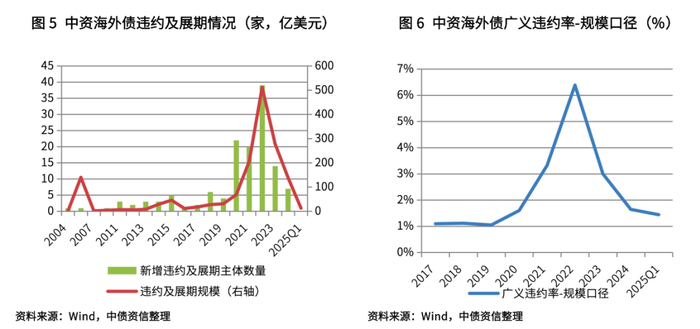 2024年以来,随着部分风险房企逐步出清,海外融资环境受国内房地产行业景气度低迷、房企风险事件不断等因素影响渐缓,海外债出险主体数量及规模持续减少。2025年一季度,中资海外债违约及展期主体数量继续收敛,季度内无新增海外债违约主体(去年同期11家),违约及展期规模12.99亿元,较去年同期减少26.66亿元。从违约率表现来看,2021年房地产信用风险暴露以来,中资海外债违约率逐渐升高至较高水平,2022年海外债广义违约率(展期及违约口径)达到4.59%,经历了大规模风险出清后,2023年以来中资地产债违约及展期主体数量及规模呈现下降趋势,2024年广义违约率为1.64%,2025年一季度广义违约率1.44%。