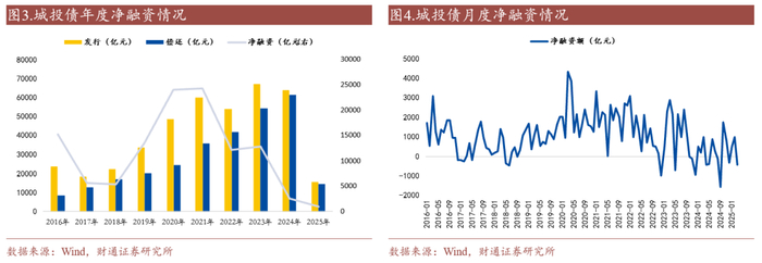 2025年以来,两会强调化债与发展并重,支持打开新的投资空间。全国两会期间出现了较多与城投相关的表述,与2024年政府工作报告中所提到的统筹化债和稳定发展相比,2025年政府工作报告中提到的“在发展中化债、在化债中发展”、“动态调整债务高风险地区名单,支持打开新的投资空间”等内容表明对发展的重视程度有所提升,一定程度上释放了支持主动发展,减少城投融资限制的信号。指引的修订,或又是顺应大势的修订。