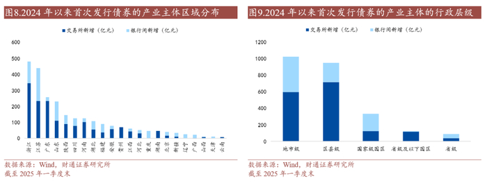 2024年至2025年一季度末共有212家首次发行债券的“产业主体”,这部分首发平台贡献了2522.57亿元的净融资增量。整体看,交易所的首发规模明显多于银行间。
